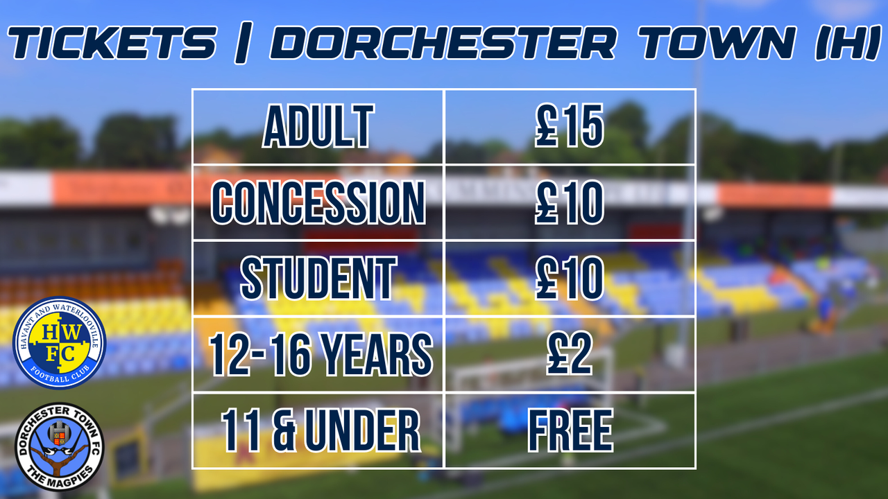 Tickets can be purchased in advance here: https://havantandwaterloovillefc.ticketco.events/uk/en/e/havant__waterlooville_vs_dorchester_town__wednesday_14th_january_2026