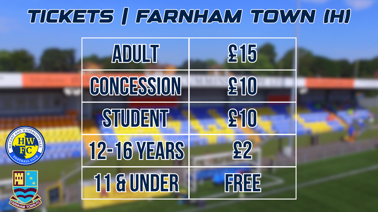 Tickets can be purchased in advance here: https://havantandwaterloovillefc.ticketco.events/uk/en/e/havant__waterlooville_vs_farnham_town__saturday_11th_october_2025