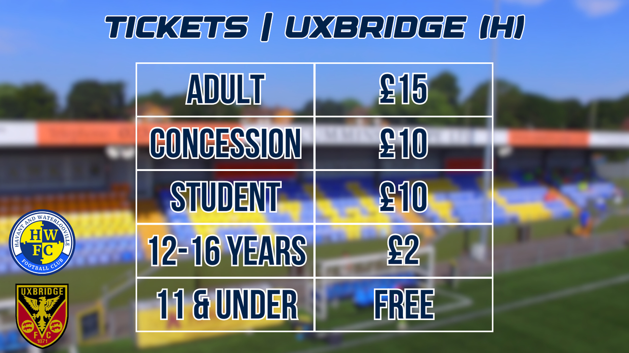 Tickets can be purchased on the gate using cash or card payments or can be purchased in advance here: https://havantandwaterloovillefc.ticketco.events/uk/en/e/havant__waterlooville_vs_uxbridge__saturday_18th_october_2025