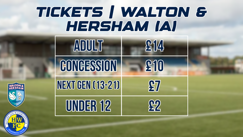 Tickets are now on sale for our trip to Walton & Hersham on Tuesday 14th October 2025, KO 19:45 Admission is priced for the fixture as follows: Adult – £14 Concession – £10 Next Gen (13-21) – £7 Under 12 – £2 ...