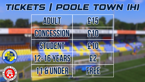 Tickets are now on sale for the visit of Poole Town to Westleigh Park on Saturday 6th December, KO 15:00 Admission is priced for the fixture as follows: Adult – £15 Concession – £10 Student – £10 12-16 Years* – £2 11...