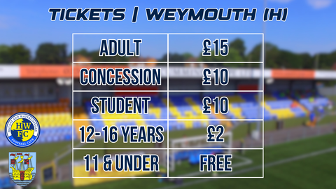 Tickets are now on sale for the visit of Weymouth to Westleigh Park on Saturday 22nd November, KO 15:00 Admission is priced for the fixture as follows: Adult – £15 Concession – £10 Student – £10 12-16 Years* – £2 11...